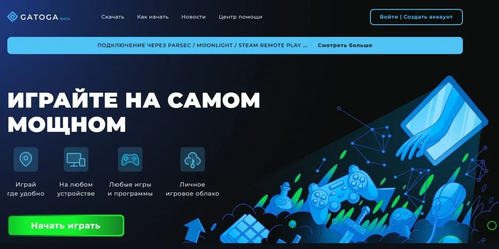 Gatoga — один из самых простых сервисов облачного гейминга. Он предлагает аренду удалённого мощного ПК. По сути вы арендуете виртуальный мощный компьютер и получаете доступ к его рабочему столу со всеми установленными играми и программами.