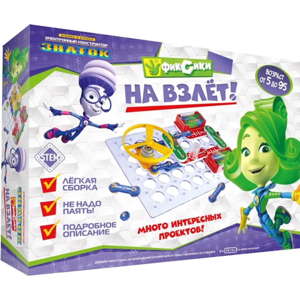ЭЛЕКТРОННЫЙ КОНСТРУКТОР ЗНАТОК ФИКСИКИ НА ВЗЛЁТ начального уровня, позволяющий ребёнку понять, как работают многие «умные вещи» вокруг нас. Ребенок сможет, исследовать схемы с пропеллером, понять принцип «тяни-толкай» в авиации. И просто позапускать пропеллер! Даже без помощи взрослых, используя очень понятное цветное руководство, всего за несколько минут, юный инженер сможет собрать и испытать схему и реализовать интересный проект и удивить родителей, друзей, учителей.