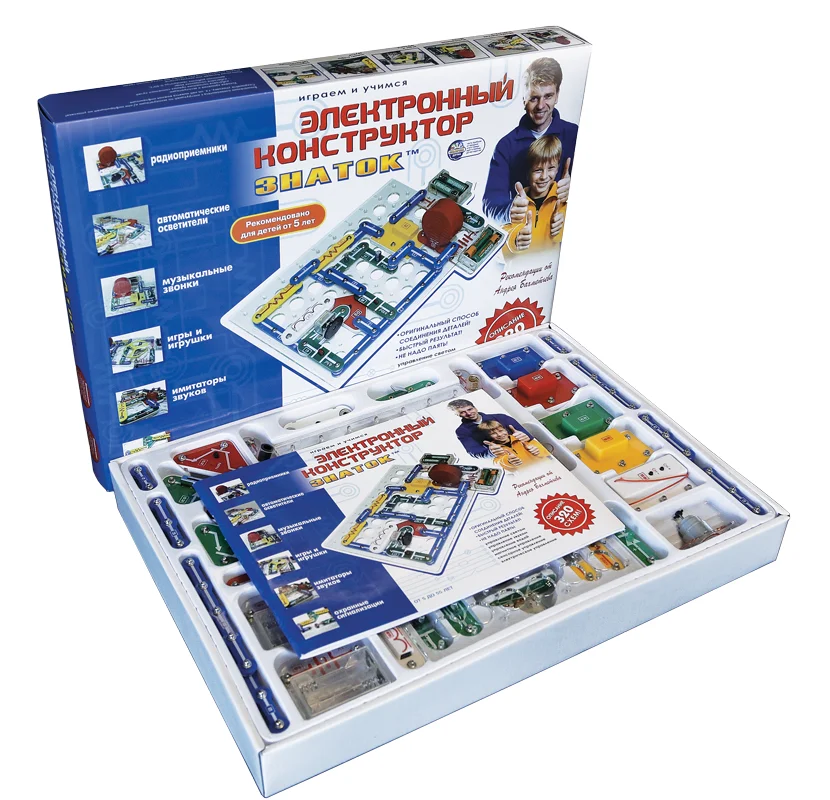 Электронный Конструктор Знаток (320 схем) позволяет ребенку своими руками создавать радиоприемники, музыкальные звонки, охранные сигнализации, имитаторы звуков, автоматические осветители, а также забавные игры и игрушки. Даже без помощи взрослых, используя только очень понятное цветное руководство, ребенок сможет собрать 320 электросхем, позволяющих на практике освоить азы управления светом, звуком, электричеством и водою.